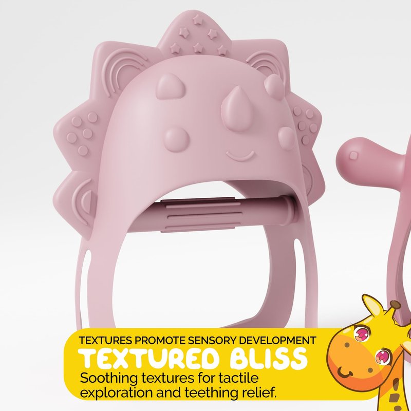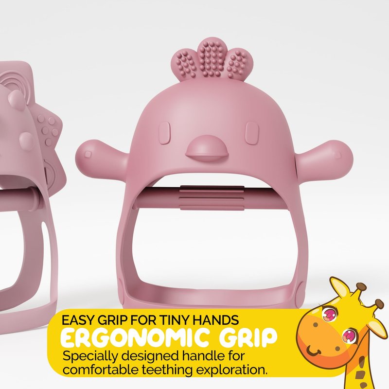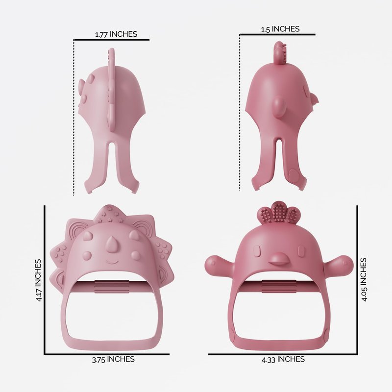 Soothe Your Little One's Teething Woes with Our Chick and Dino Baby Teething Pacifiers Make teething a little more bearable for your baby with our adorable Chick and Dino Easy Grasp Baby Toy. Crafted with care and designed with your baby's comfort in mind, these Chick and Dinosaur Teether for baby offer a convenient and soothing solution for teething discomfort. Silicone Teething Mitten for Gentle Relief for Sore Gums: Teething can be a challenging time for both babies and parents, but our non toxic toys for babies are here to offer relief. Made from soft, BPA-free silicone material, they provide gentle stimulation and soothing pressure to help alleviate sore gums. Silicone teether pacifier Cute and Comfortable Design: Say goodbye to bulky teething toys that are easily dropped and lost! Our chick and dino wrist teethers feature an innovative design that your baby can wear comfortably around their wrist. Stylish and Functional Baby Chewing Toys Not only do our wrist teethers for babies 0-6 months provide much-needed relief during the teething phase, but they also double as cute and stylish accessories for your little one. The chick and dino baby pacifier toy designs add a playful touch to any outfit, making them a fun and functional addition to your baby's wardrobe. Easy to Clean and Maintain Wrist toys for babies 0-6 months We know that busy parents need practical solutions, which is why our hand teethers for babies are designed for easy cleaning and maintenance. Simply wash the teething toys pacifier with mild soap and water or toss them in the dishwasher for a thorough clean. The Perfect Teething Companion: Whether you're at home or on the go, our chick and dino chewable toys for babies are the perfect companion for your teething baby. Lightweight, portable, and oh-so-cute, they provide instant relief whenever your little one needs it most.