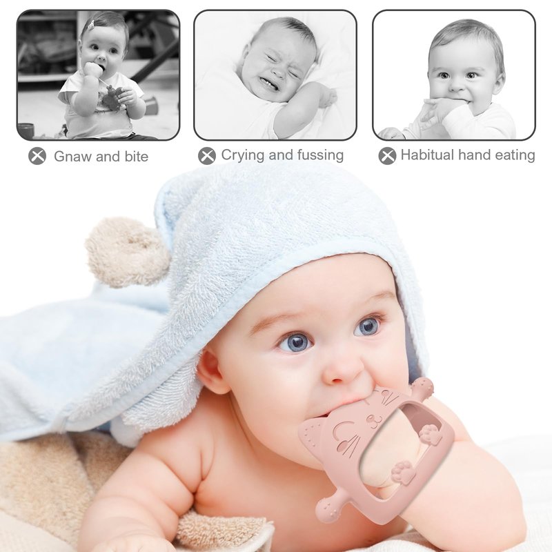 - 【Teething Toys For Babies 0-6 Months】Our cartoon cat baby teether is specially designed for newborns, the teether toys imitates a nipple shape on both sides,which may help babies transition from breastfeeding or bottle feeding to chewing on a teething toy,and soft silicone touch points on the top are designed to accommodate baby's bite in different directions. This design element can provide a familiar feel for babies and make them more comfortable with the teether