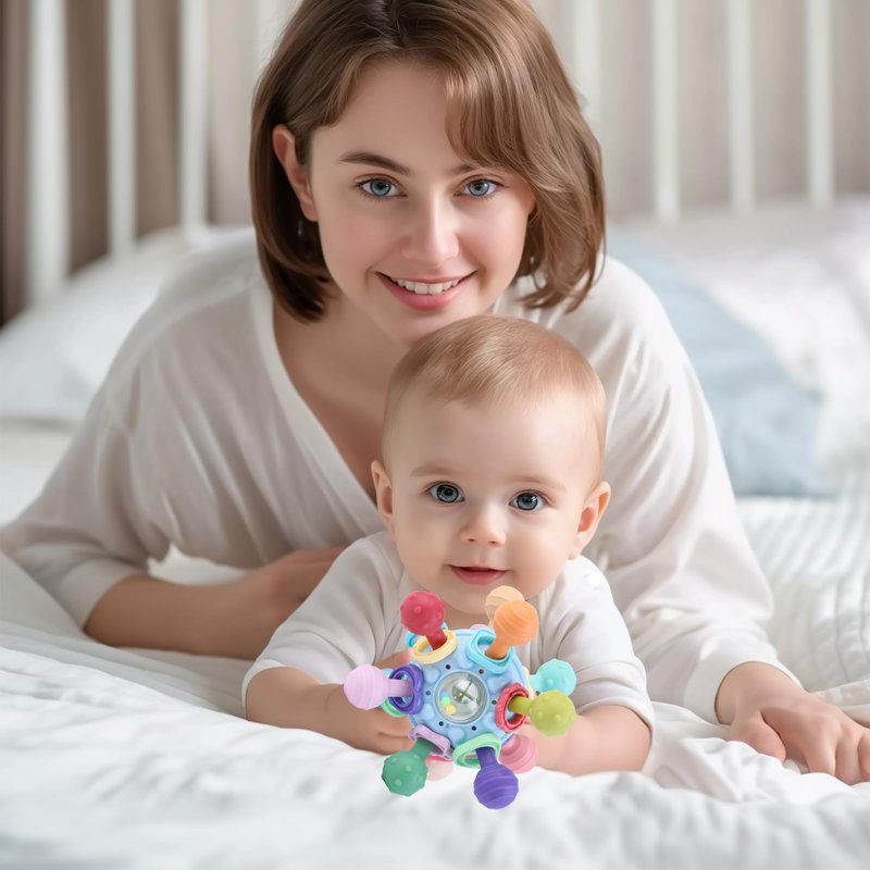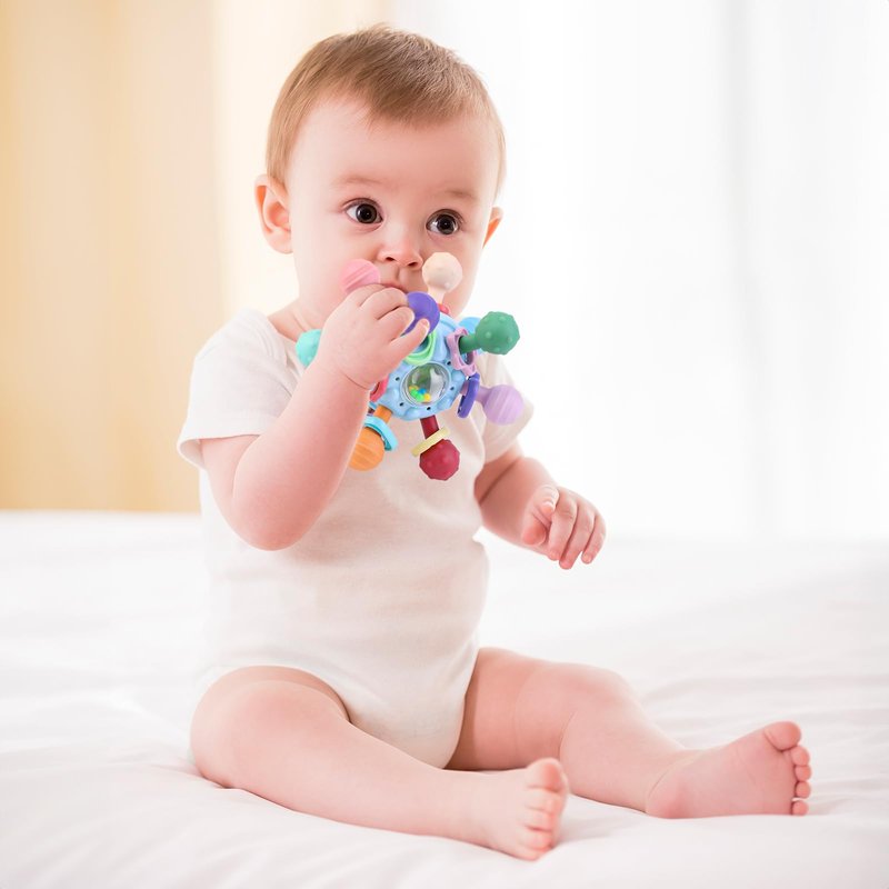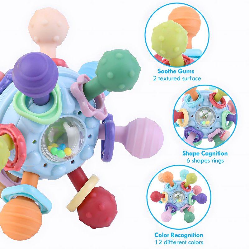 - Multi-Sensory Baby Toys: This montessori teething toy offers babies a variety of sensory exploration. Bright colors attract baby's attention and stimulate the visual senses. Different textured surfaces can stimulate baby's sense of touch. The built-in beads rattle around when shaken to stimulate baby's auditory senses. Twisting the two half spheres makes a crisp clicking sound to develop baby's fine motor skills. Combines multiple functions in one to promote baby's sensory development!