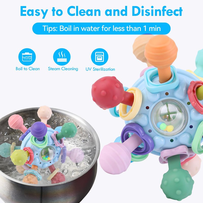 - Easy To Hold & Clean: The silicone teether toy has multiple gripping points that baby can easily grip. In addition, the product is sized to fit the small hands of babies 3-6 6-12 months old, not easy to slip off. The baby teether toys is all in one piece without small parts. TIPS: Sterilize baby toys by boiling in water before first use, boil in water for less than 1 min.