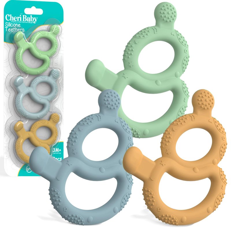 Baby Teething Toys for Babies 0-6 Months Set of 3, Cheri Baby Teether for Teething Relief, 100% Food-Grade Silicone Baby Toys 6-12 Months, BPA Free Soft & Textured 8-Shape Sensory Toys for Sore Gums