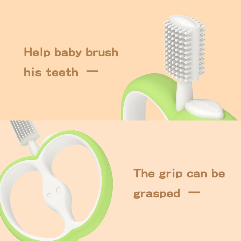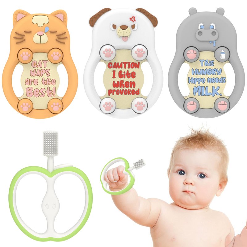 - 3 Cute Animals&1 Massaging Toothbrush: Three amusing animals perfectly depict the funny events that happen throughout a baby's day. The apple-shaped massaging toothbrush not only provides a convenient grip but also helps Teething Relief. We aim to build an emotional bridge between children and mothers through humorous language and vibrant colors.