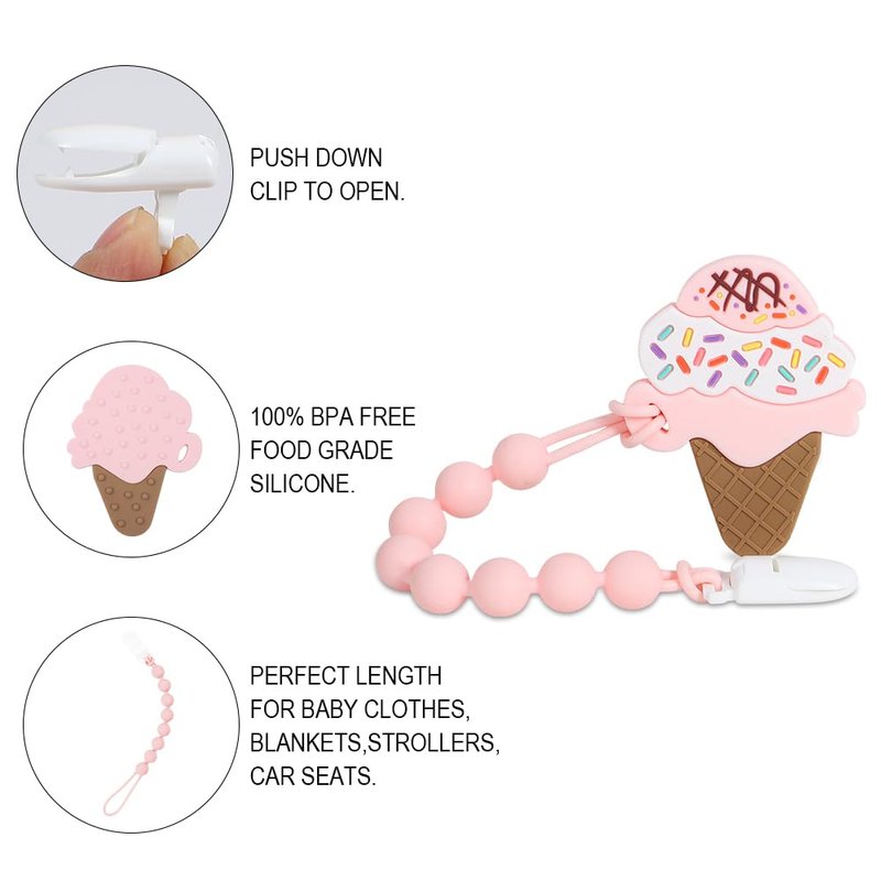 Baby Teething Toys,Food Grade Silicone Teether with One-Piece Pacifier Clip Holder,Baby Gift,Highly Effective Pain Relief for 3 Months+ Boy and Girl,BPA Free,Freezer Safe. (Ice Cream)