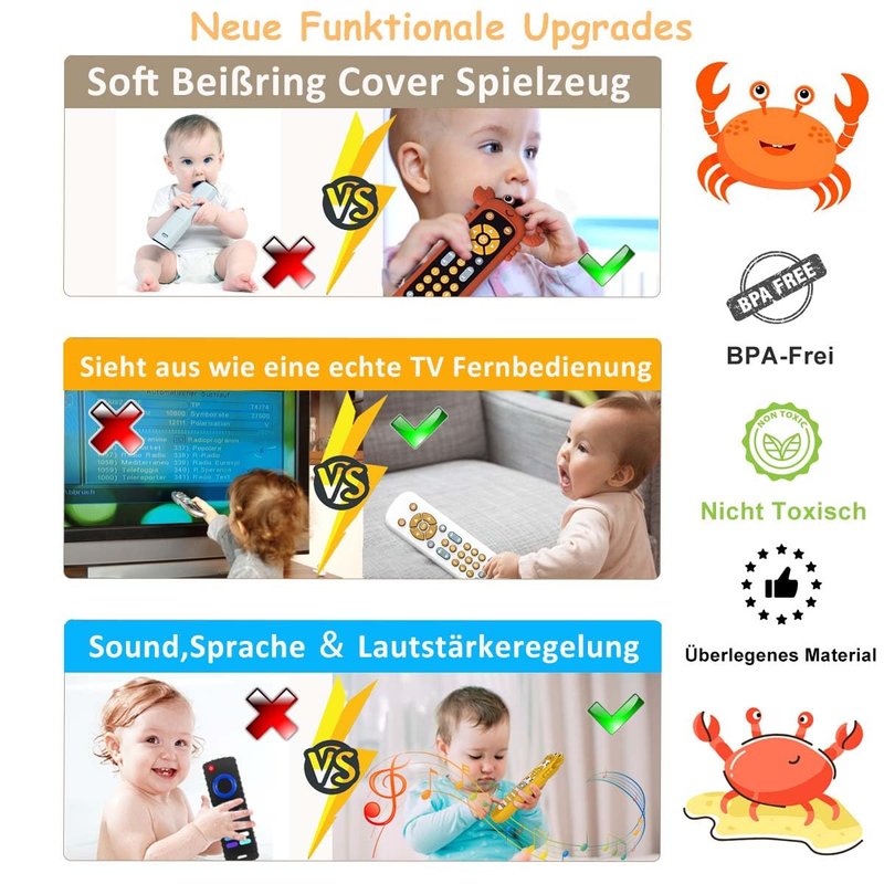 Baby TV Remote Control Toy with Soft Silicone Teether Cute Crab Cover, Musical Realistic Play Remote Toy with Light and Sound, 3 Language Educational Learning Toy for 6M+ Boy and Girls