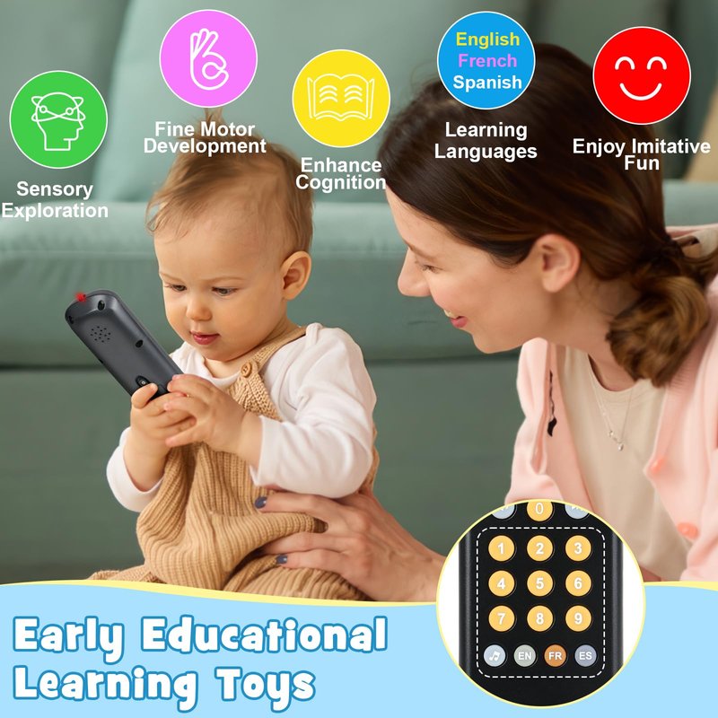 - 【Various Sound Effects & Multi Languages】This baby musical toy has various interesting effects, nice melodies, imitative animal, vehicle and instrument sounds. The TV remote control toy can pronounce numbers 0-9 in 3 different languages, which helps improve baby's numbers cognition and language learning ability while playing.