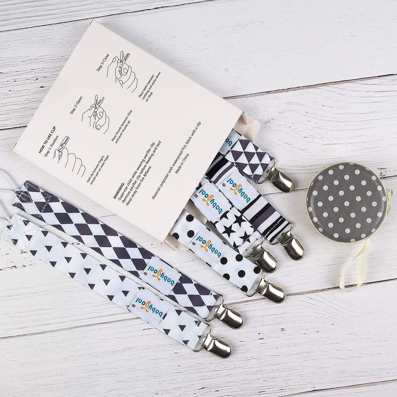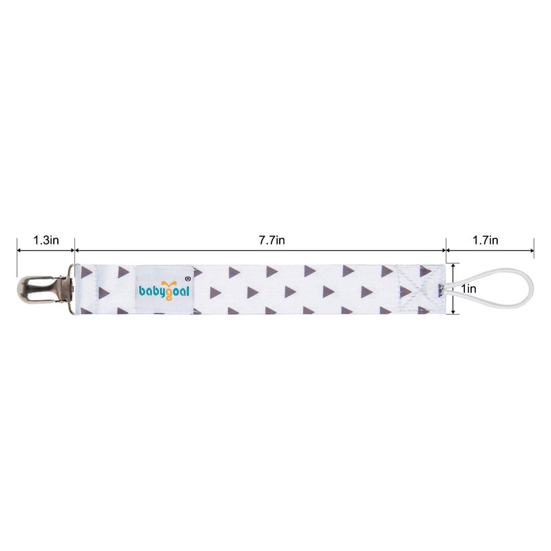 - Safety: The stylish pacifier leash are made of one-layer polyester fabric, and they are washable, durable and soft. Clips with plastic teeth hold tight and will hardly damage baby's clothes or discomfort the baby, but please do not let your baby chew on the clips to avoid a choking hazard.They are BPA Free, Phthalate Free, Latex Free, Lead Free, suitable for babies all ages
