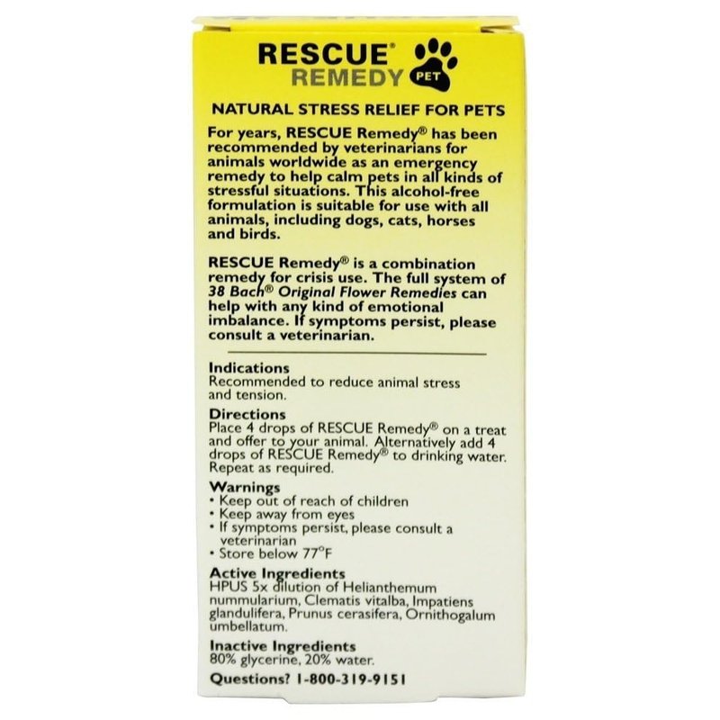 - BACH RESCUE REMEDY PET DROPPER: Stress relief tincture for pets with natural flower essences to help ease tension, nervousness & excitability. For dogs, cats, horses, rabbits, birds & lizards