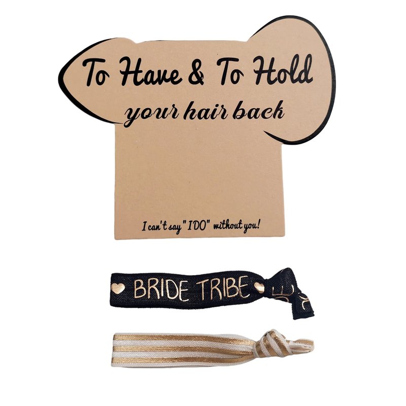 Introducing the To Have and To Hold Hair Ties Card, a hilarious and playful addition to any bachelorette party or bridal shower! With 28 hair ties included, this set features a funny -shaped hair tie for the bride and 26 black hair ties with hearted print for the bridesmaids, making it an ideal bachelorette gift.