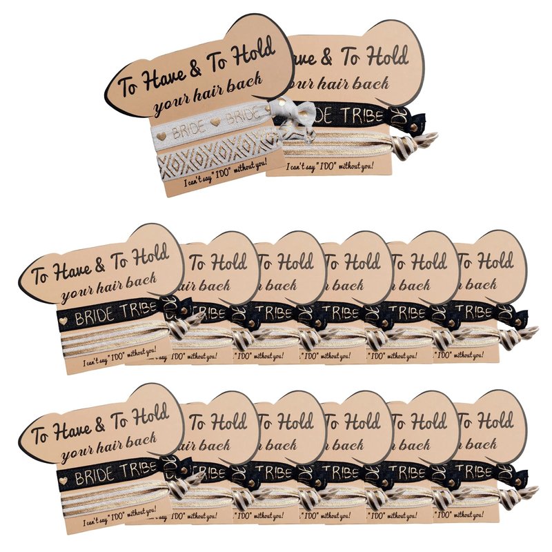 - A complete set of bachelorette party hair ties that includes a diamond shaped card with 28 hair ties, 2 white for the bride and 26 blakc for the bridemaids.