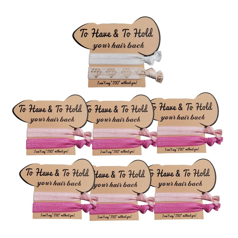 - A complete set of bachelorette party hair ties that includes a funy-shaped 7 pcs card with 14 hair ties, 2 white for the bride and 12 pink for the bridemaids.