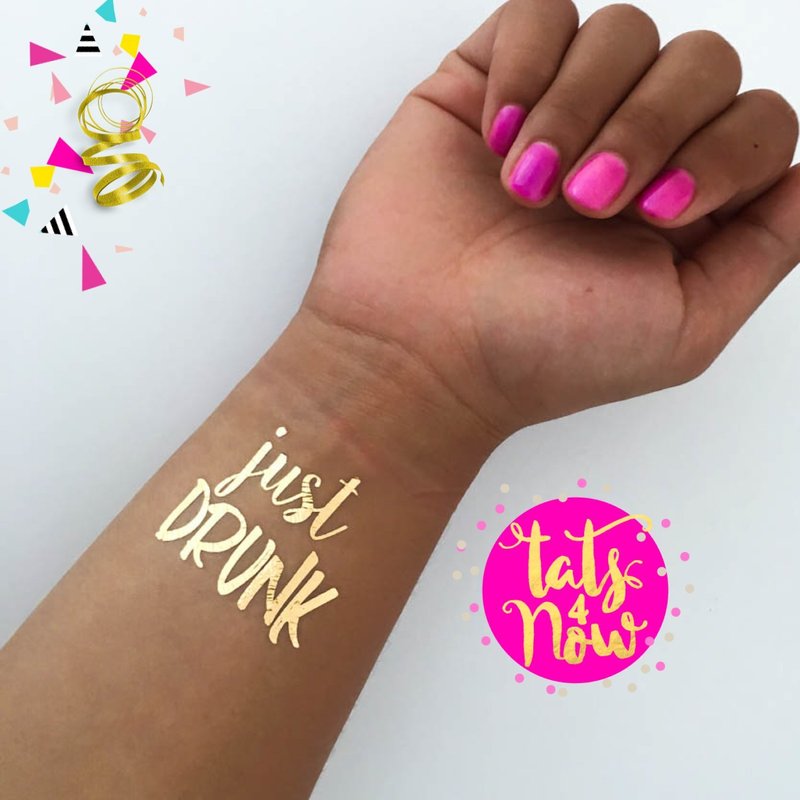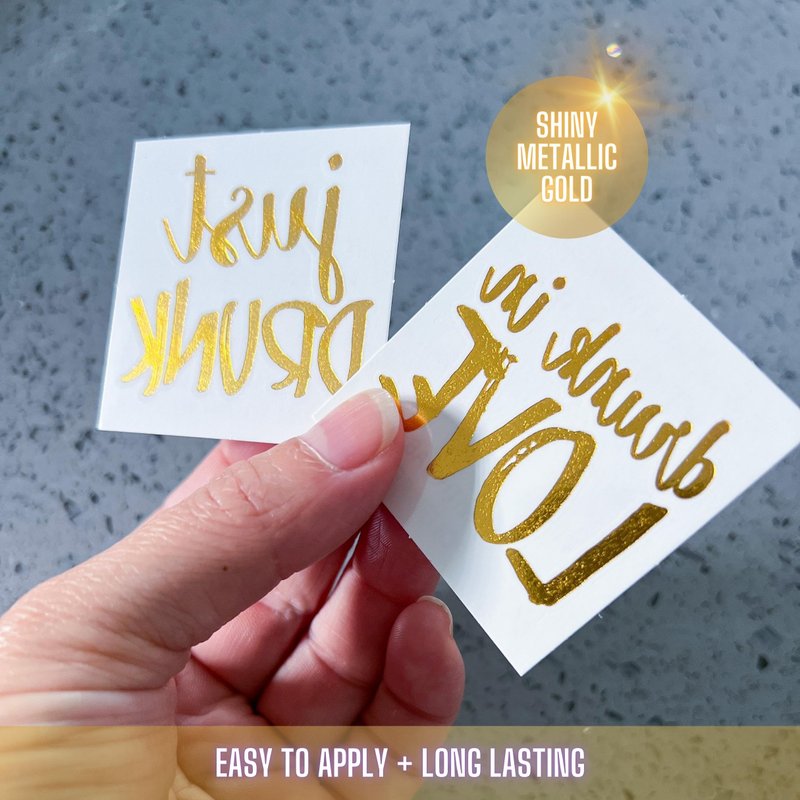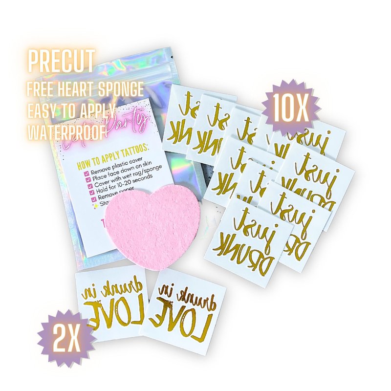 You will receive a total of 12 gold temporary tattoos. 10x of our "Just Drunk" gold temporary tattoos AND 2x of our "drunk in love" gold temporary tattoos.