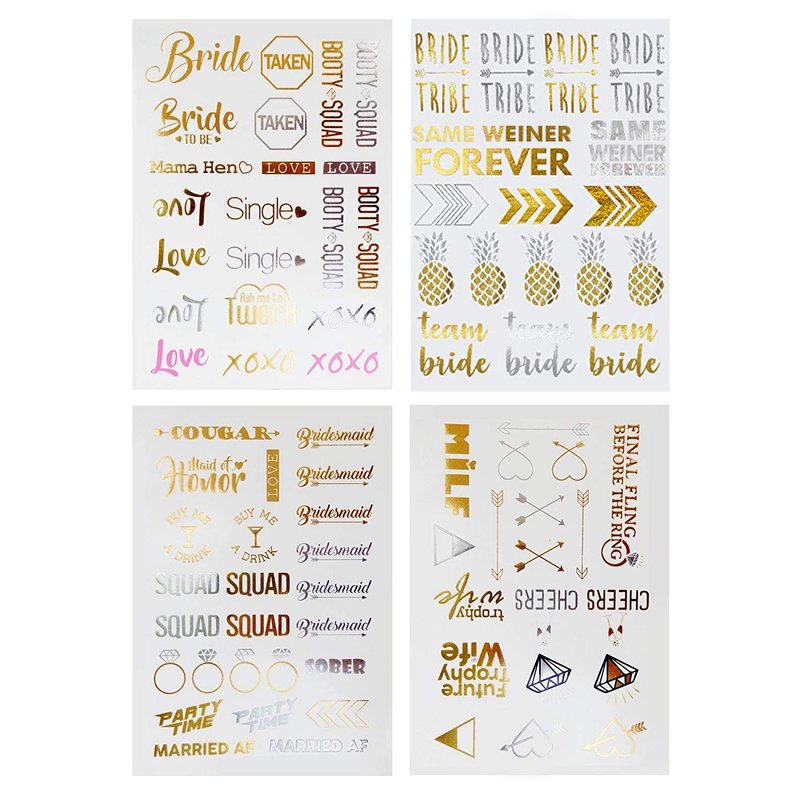 - COMES WITH 4 SHEETS OF BACHELORETTE PARTY METALLIC TATTOOS - Which include one whole page of shiny metallic peckers, "Bridesmaid", "Cheers Bitches", and "Booty Squad". We also threw in some diamonds, hearts and rings for your new sister in law.