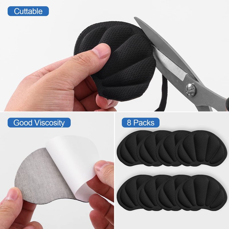 - STAY IN PLACE - 8 pieces x back of heel cushion. Strong self-adhesive backing is made from advanced double-sided tape to prevent slipping.