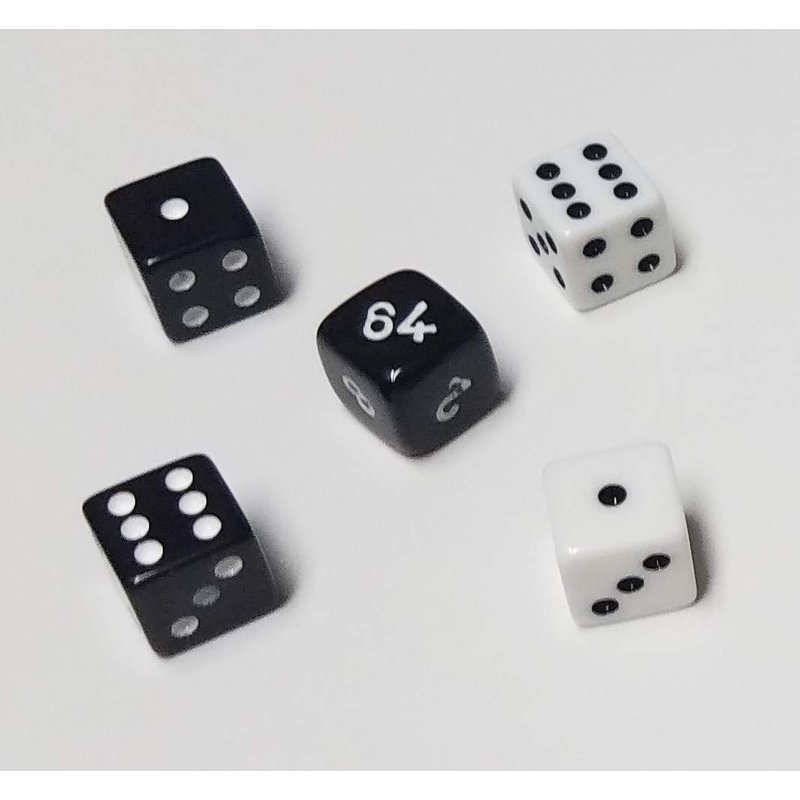 Very small Backgammon dice including a 10mm doubling cube. Other dice are 2 black and 2 white standard 6 sided dice but they are also very tiny. See picture for reference (penny not included).