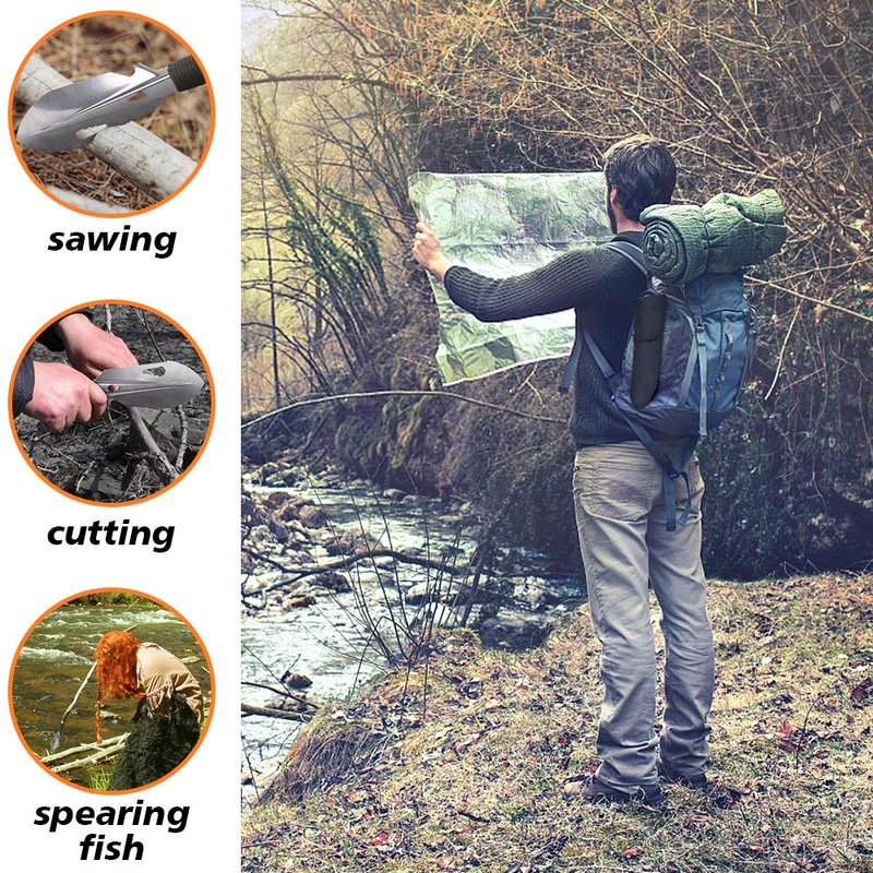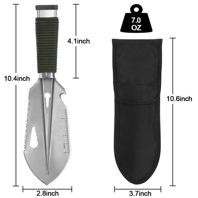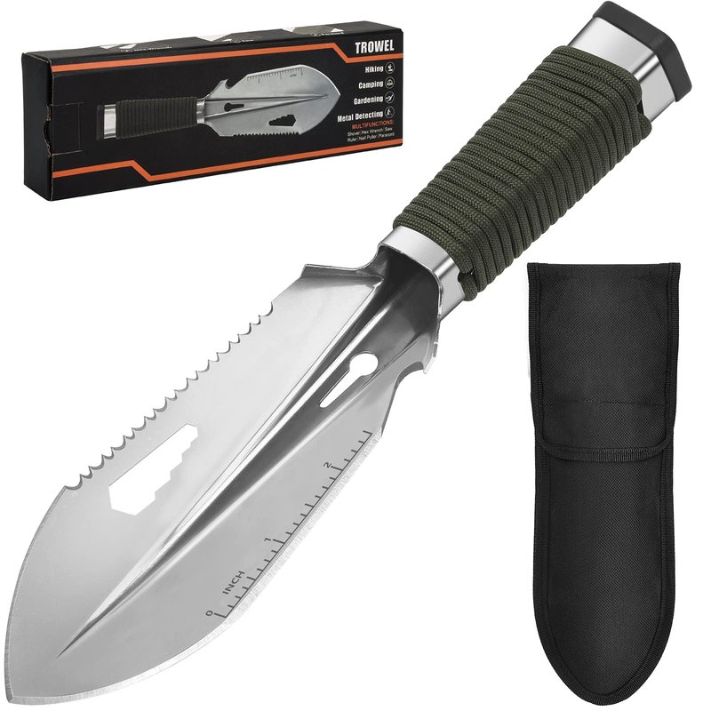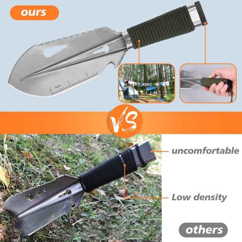 - Multifunctional Camping Trowel: What appears to be a simple digging tool is far more than expected. Incorporated within its stainless-steel design are several useful outdoors tools including a saw, ruler, hex wrench, nail extractor, and 110 inches of super strong paracord. The entire tool can be substituted as a tent spike or even buried in the ground as a tie-down for your shelter. You can be sure to be prepared for anything