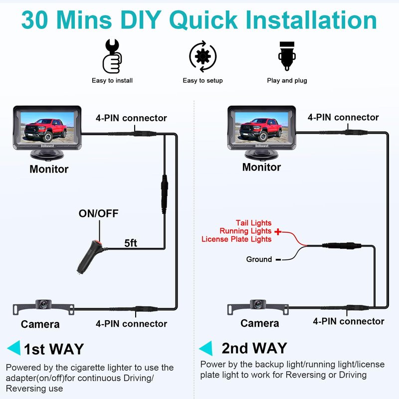 - [ Wide Range of Applications ]: This truck backup camera set is suitable for ford f150, cars, trucks, campers, RVs, tractors, pickup, SUVs, minivans and other automotive.