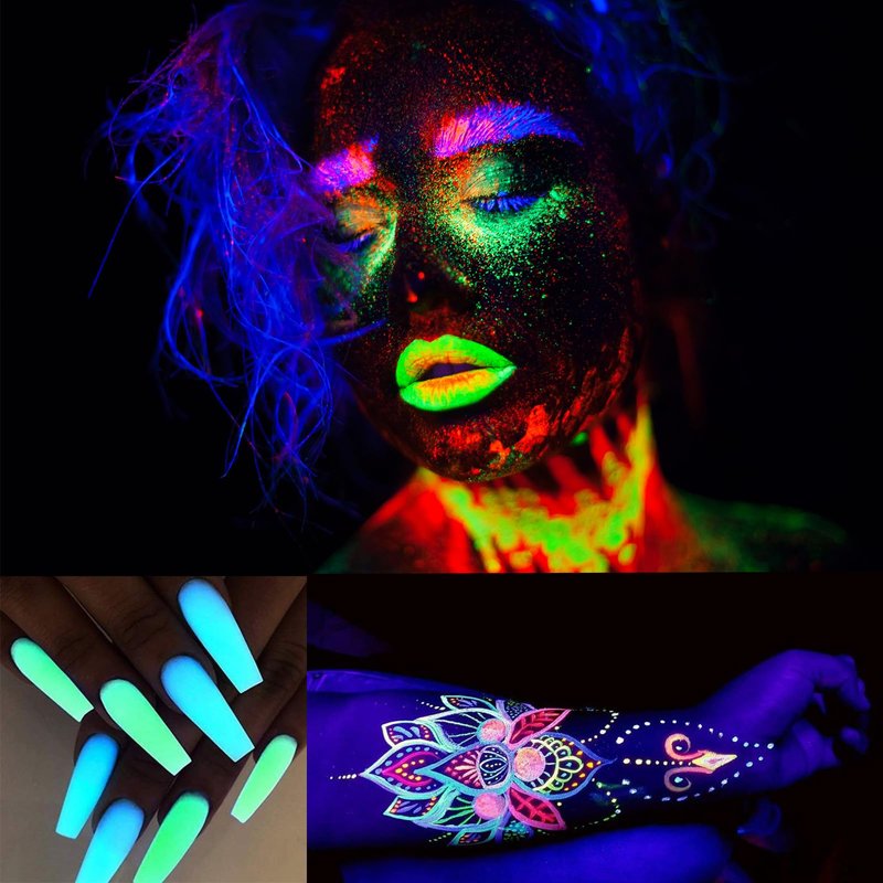 - ✨Neon Holographic - 5 Individually packed loose powder is 3g per bag with UV sequins, under the black light it will react luminous vibrant glam effect. This kit also packed with adhesive glue to keep you shining at any parties and occasions. It is a great way for you to have fun and be festive and you can do your own art graphic works!