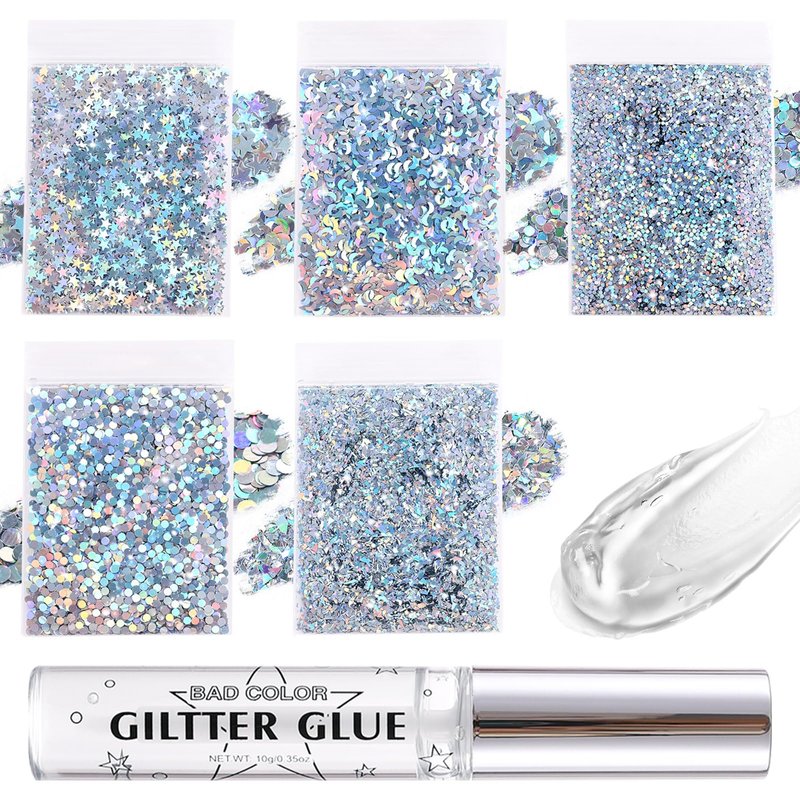 BADCOLOR 5 Packs Silver Body Glitters with Glue Kit, Holographic Chunky Sequins for Face, Body, Hair, Eye Makeup, Nail Art, Loose Glitter for Music Festival Carnival Concert Party Rave Accessories