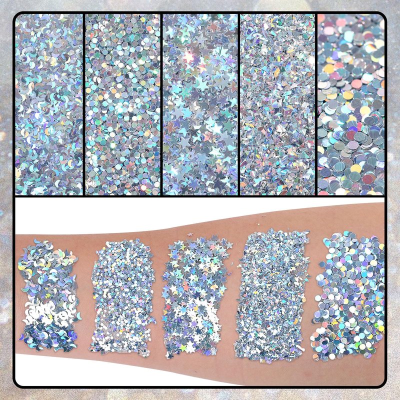 - ✨ Different Style -This super glow face glitters included assorted gradient iridescent silver. Lightweight non-irritating flakes ,comfortable on skin. Suitable for all skins and all ages. You can use these colors to create shimmery glitter tears, eyeshadow and glitter braids, cheekbone highlights, nail art decorations and craft projects. All depends on your creative ideas.
