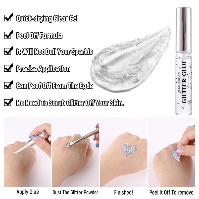 - ✨Glitter Glue - Quick-drying glue gel comes in a tube with easy-to-use soft applicator, leaving your finger or brush clean, easy to peel off from the edge, no difficulties of removing chunky glitters, no scrub and scratch your skin. This product is 9ml. Usage: You can apply a thin layer of glue on face or body position you want, dust the glitter powder on it and wait for a minute to let it dry. It can lasts all night long. If you wanna remove it just gently peel it off.