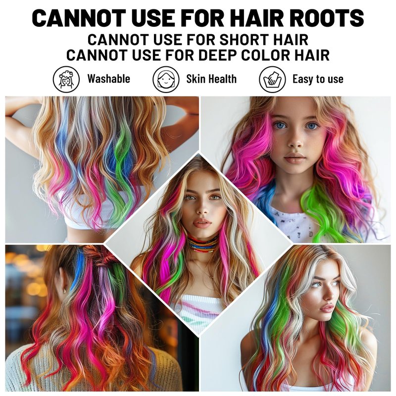 - Fun and Easy: Our temporary hair chalk for kids is designed to be mess-free and easy to use. Simply color your child's hair with the provided hair chalk combs, and watch their imagination come to life. NOTICE: Not work for short hair. Not work for deep color hair, Not work for hair roots.