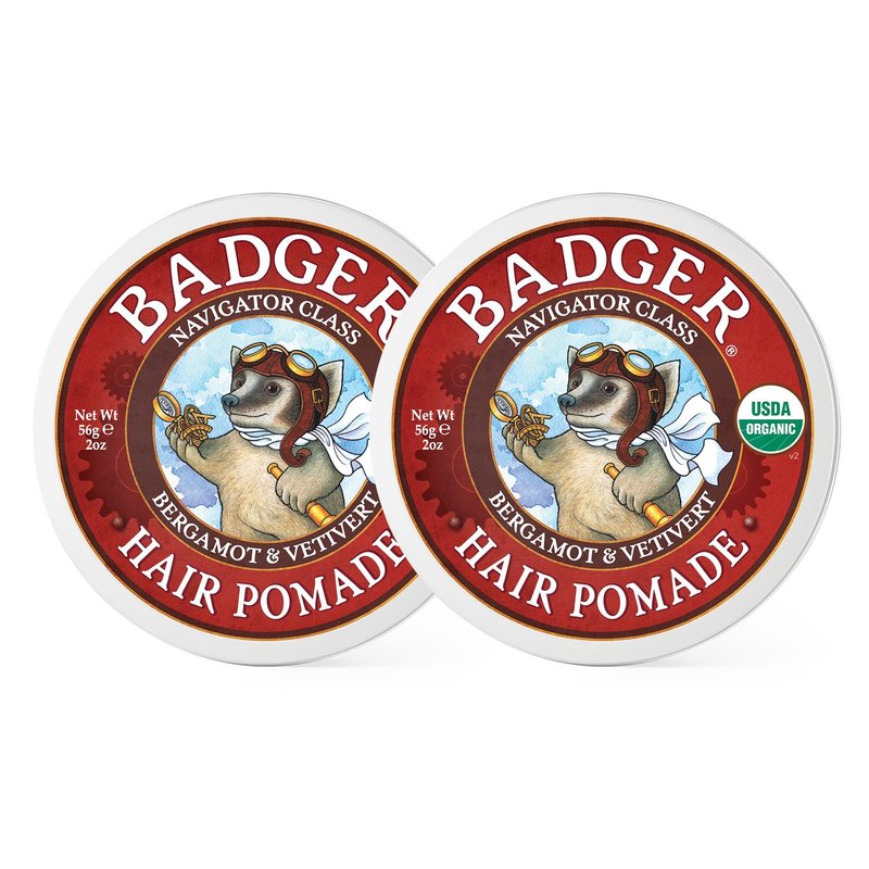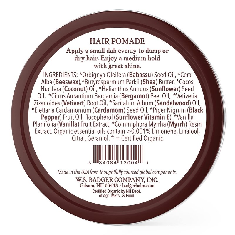 - ORGANIC HAIR POMADE IN A METAL TIN - Your search for a nourishing, all-natural hair pomade ends here. Badger Hair Pomade provides medium hold with great shine, and nourishes your scalp and hair.