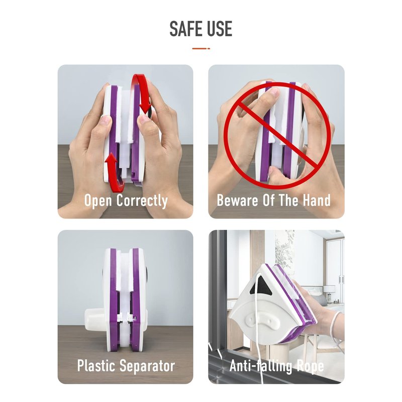- 【Anti-pinch Separator】For thicker or double-layer or vacuum glass, strong magnetic force is required, so please use this magnetic glass wiper correctly. Hold the handle of window cleaner, and rotate the two sides of the window cleaner by 90 degrees. Please pay attention to your hand when you close or take them apart.