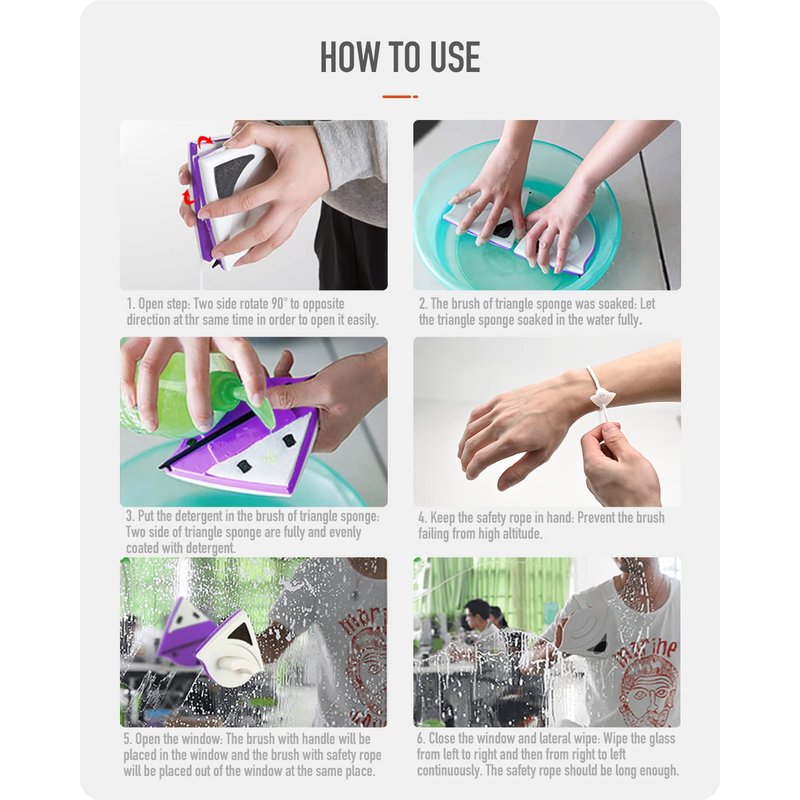 Overview: This window cleaning brush is suitable for 18-30mm thickness window. Please understand your glass thickness before order and choose the correct specifications. Different magnetic glass cleaner should be used on glass in different thickness,otherwise it can not move or fall off. We also have different kinds of thickness window cleaning brush : 3-8mm,8-15mm,15-26mm,4-30mm. What's included? 1 * window cleaner 1 * replacement(fixed Buckles,Triangle Sponges,rubber scrapers) How to use it? 1.Open: Hold the handle of window cleaner, and rotate the two sides of the window cleaner by 90 degree. Please pay attention to your hand when you close or take apart them. 2.Remove the plastic anti-pinch Separator . Ensure that the two side magnetic window cleaner will not be directly glued together during use, otherwise it will be difficult to open. 3.Soak the sponge. 4.Add detergent. 5.Two sides of sponge rub against each other. 6.Tie the safety rope with your hand. 7.Gently approaching: put one side with rope outside and leave another side inside. 8.Wipe the glass: Move the window cleaner in the direction of the downward pointed end so there are no streak left on the window. Warm tips: Because of the powerful magnetism please pay attention to your hand when you close or take apart them. New packaging upgrade, you can scan the QR code to watch the video how to use it correctly or read the instructions manual.