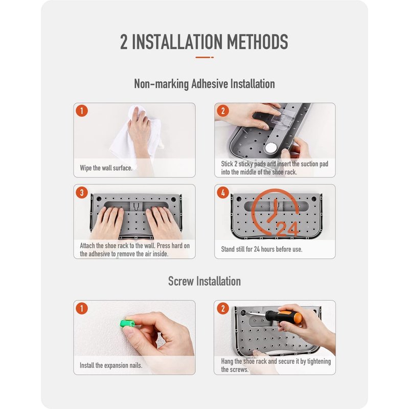 - Multiple installation: There are not only strong sticky pads to stick the wall mounted shoe rack to the smooth surface without leaving marks, but also two holes on the shoe rack for drilling on the rough wall.