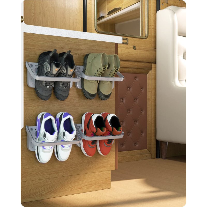 Specification: Material: PP plastic Each Size: 11¡± x 5.5¡± x 4/5¡± Each Weight: 0.24 lb Color: Gray Properties: This hanging shoe organizer is different than other shoe shelves. They are wall mounted and can be mounted on the smooth wall with stickers or nailed to the rough wall with nails. It saves space. There is a groove on the shoe storage on which the heels of the high shoes can be placed. The shoe holder is a compact and narrow hanging shoe storage that takes up minimal space and makes your room more tidy. Package included: 4 * shoe racks(Includes stickers, but no nails) Installation: 1. wipe the desired spot 2. tear off the foil of the sticker 3. stick the sticker in the desired place then press it firmly and waiting for 24h. 4. hang the shoe rack on the sticker Wall Mounted Shoe Rack Hanging Shoe Organizers Folding Shoe Rack Organizer for Wall Door Entryway Plastic Shoes Storage Shelf With Strong Adhesive Sticker Shoe Rack for Closets Hanging Heels Shoe Holder Small Spaces Saving Waterproof RV Storage