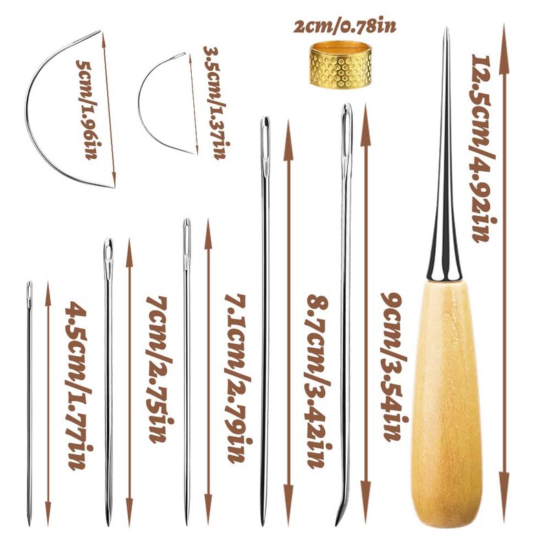 - Various Upholstery Repair Needles: Our leather sewing kit contains 7 types of needles and 1pieces of sewing thimbles, which can be matched with waxed thread to form a complete upholstery repair kit. Various needles include big eye hand sewing needles, Triangle stitching needles, Sack needles, etc.
