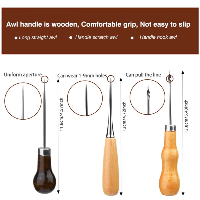 - Sewing Awls: leather stitching kit contains three awls with different functions, long straight awl for punching holes, scratch awl for enlarging the hole, can wear 1-9mm holes, hook awl for hooking the thread and sewing, perfect sewing awl Combination does not require you to purchase separately.