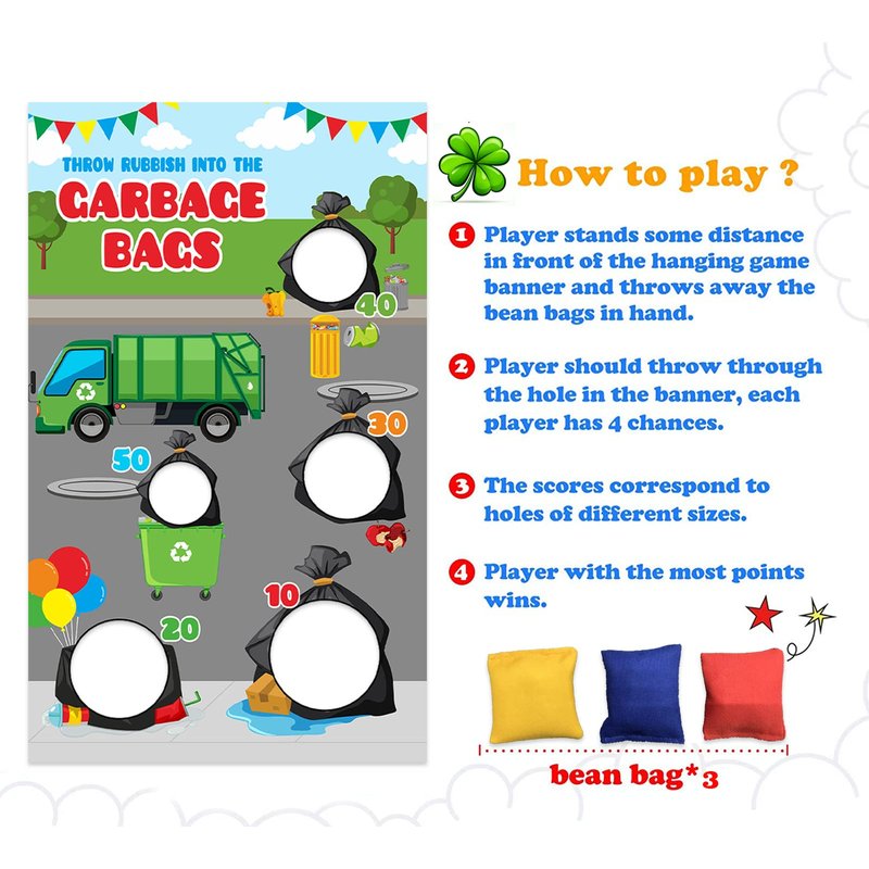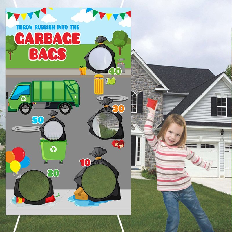 Bags Garbage Truck Trash Trucks Toss Games Banner Backdrop Waste Management Recycling Bin Throw Rubbish into the Garbage Theme Decor Decorations for Boy Girl Birthday Party Baby Shower Supplies Gift