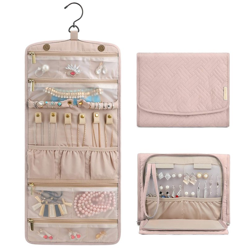 BAGSMART Travel Hanging Jewelry Organizer Case Foldable Jewelry Roll with Hanger for Journey-Rings, Necklaces, Bracelets, Earrings, Soft Pink