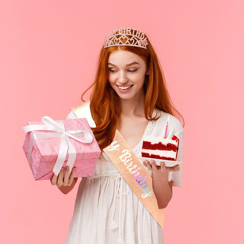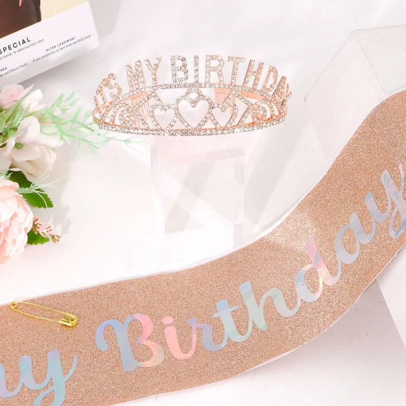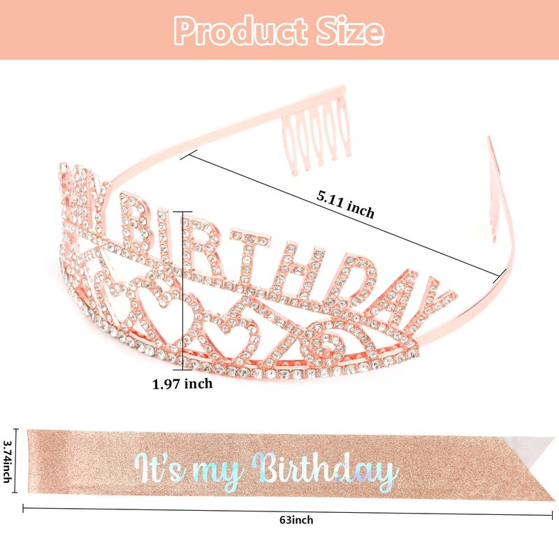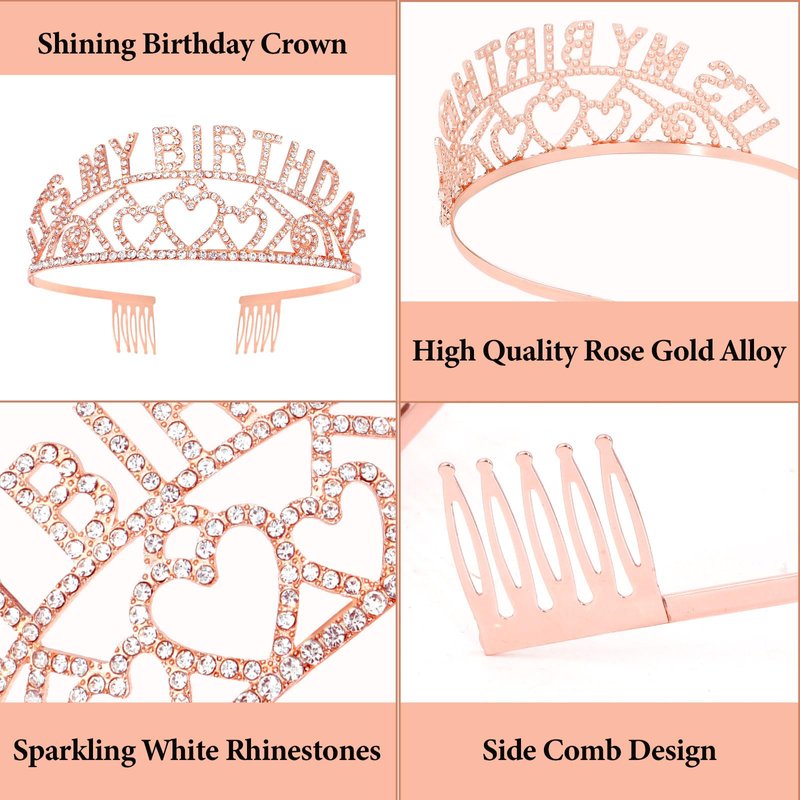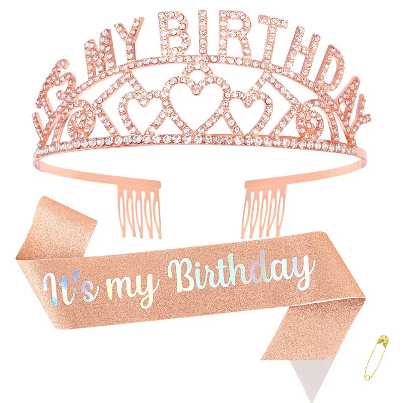 BAHABY It's My Birthday Sash & Rhinestone Birthday Tiara Set Birthday Sash and Crowns for Women Happy Birthday Decorationss- Rose Gold