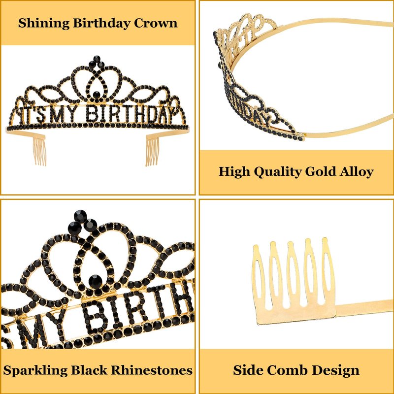 BAHABY It's My Birthday Sash & Rhinestone Tiara Set Princess Birthday Sash and Tiara for Women Birthday Decorations (Black)