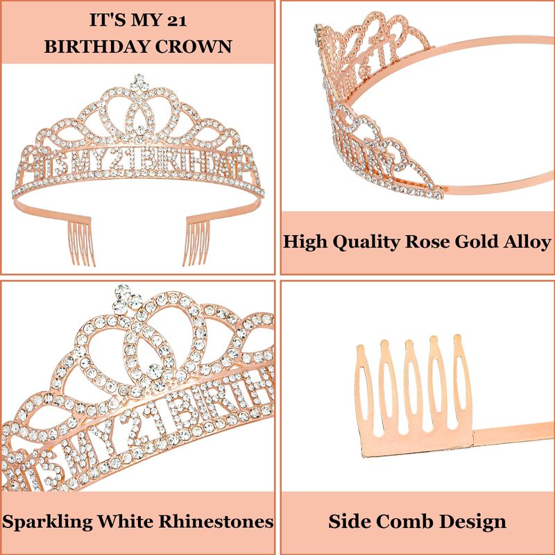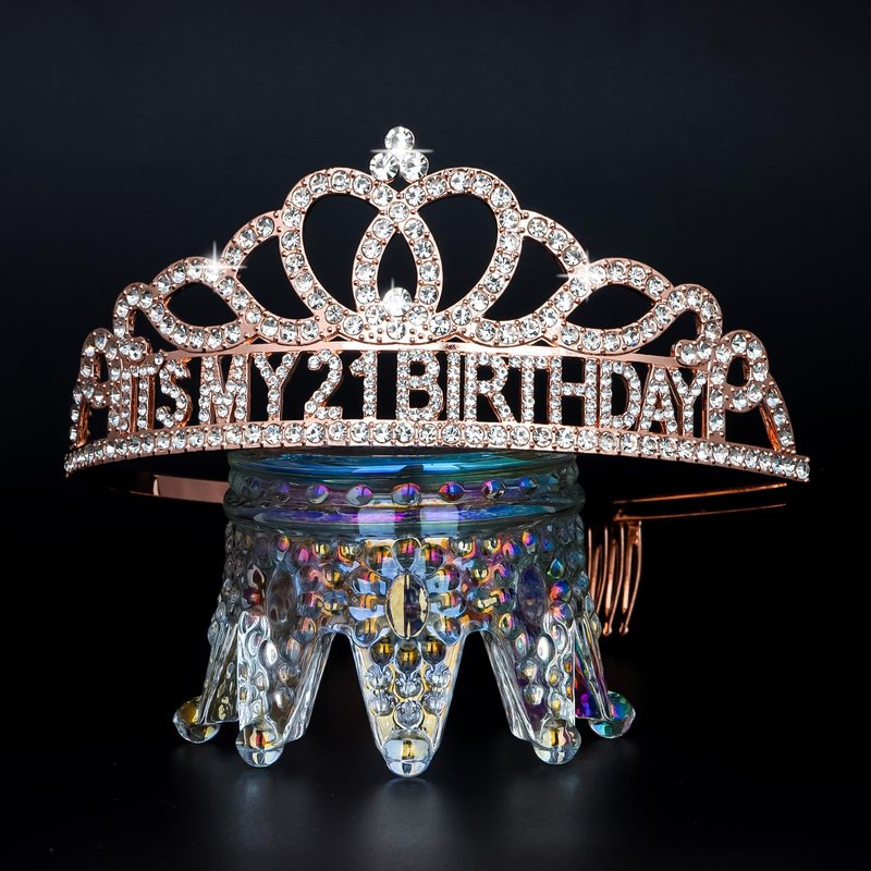 - IT'S MY 21 BIRTHDAY Tiara: Designed by our designers, this crown is absolutely unique. Beautiful crown is made of quality rose gold metal and white crystals, durable and comfortable to wear. The tiara is in 5.0 inch diameter and 2.0 inch high, letter “IT'S MY 21 BIRTHDAY” height 0.6 inches. You can dance with it all night without feeling uncomfortable