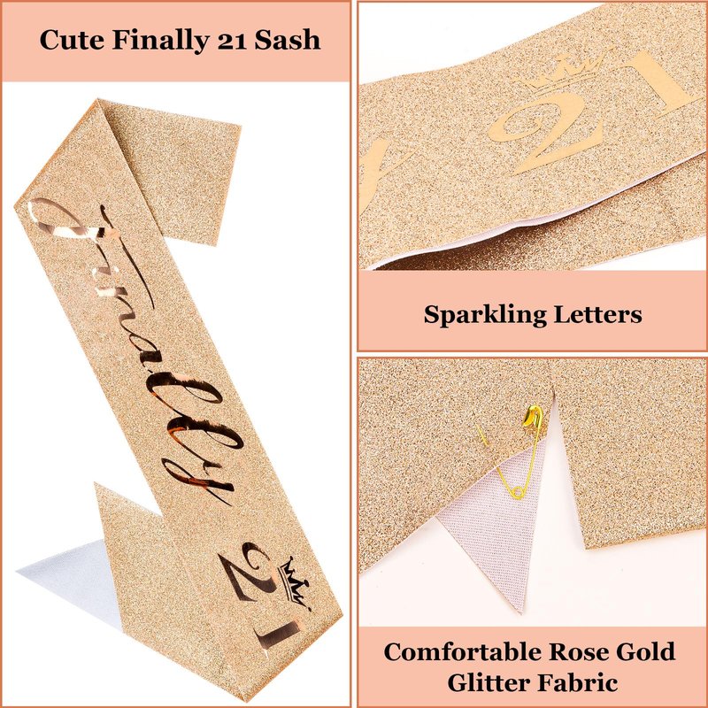 - Finally 21 Sash: Made of high quality rose gold glitter cloth and printed with words reads “Finally 21”, cute and gorgeous! The sash is in 63 inch length and 3.74 inch width, suitable for almost everyone