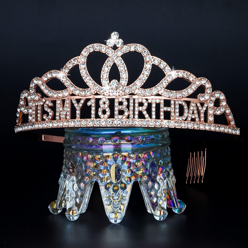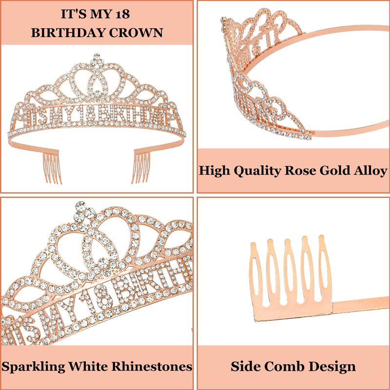 - IT'S MY 18 BIRTHDAY Tiara: Designed by our designers, this crown is absolutely unique. Beautiful crown is made of quality rose gold metal and white crystals, durable and comfortable to wear. The tiara is in 5.0 inch diameter and 2.0 inch high, letter “IT'S MY 18 BIRTHDAY” height 0.6 inches. You can dance with it all night without feeling uncomfortable
