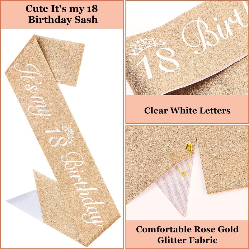- It's My 18 Birthday Sash: Made of high quality rose gold glitter cloth and printed with words reads “It's my 18 Birthday”, cute and gorgeous! The sash is in 63 inch length and 3.74 inch width, suitable for almost everyone