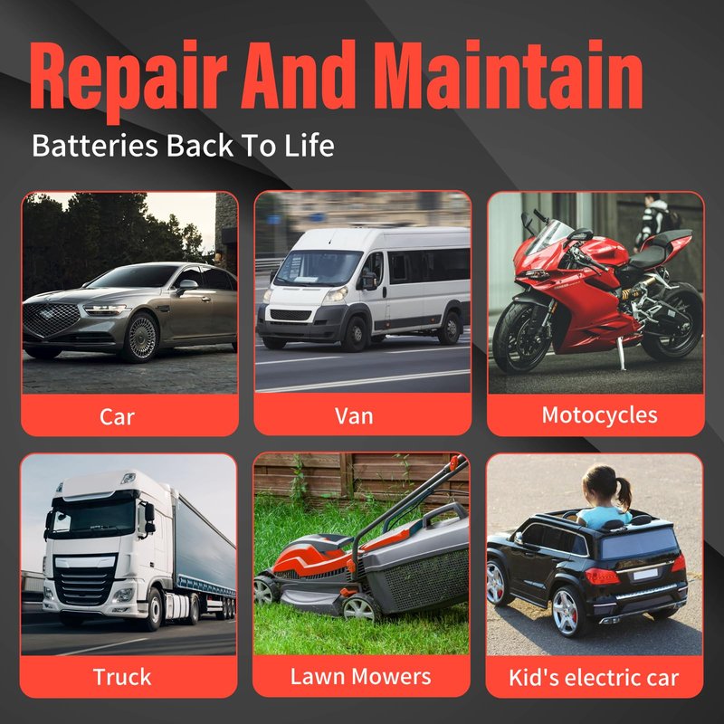 Charge or repair all types of 6V and 12V lead-acid, flooded or sealed maintenance free batteries including AGM, GEL, SLA, and Flooded in cars, SUVs, motorcycles, lawnmowers, boats, marine, scooter, snowmobile, trucks (small), electric vehicle, electric tools etc.