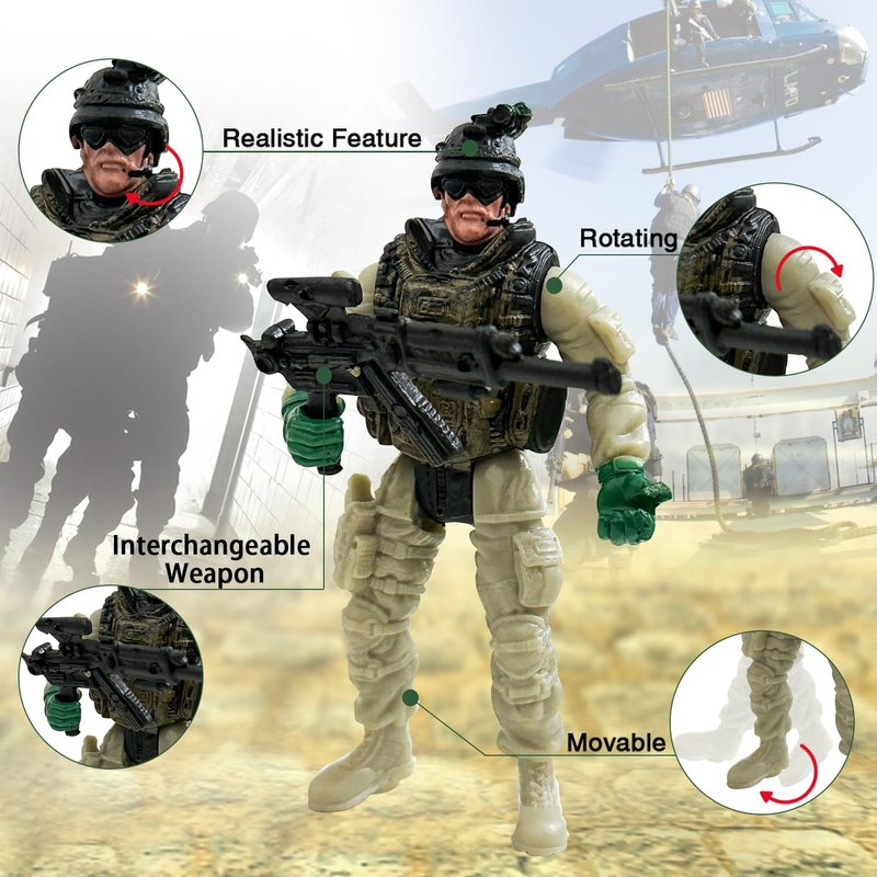 - Realistic Army Men Set for Boys: Each soldier is equipped with a unique weapon , you can change weapons according to your preference, making them perfect for home decoration, room ornament, or cake topper