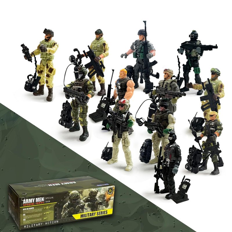 12 distinct styles of army men soldiers toy accompanied by a comprehensive black weapon set, featuring authentic details, exquisite design, and a diverse array of components.