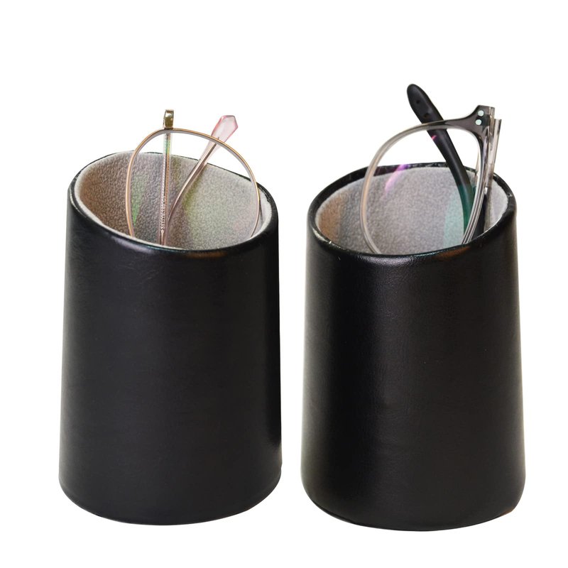 These Eyeglasses Holders feature soft plush lining, luxurious synthetic leather exterior in Black and a non-slip base. Plush lining keeps your glasses scratch and smudge-free. Upright construction lets you easily store your glasses in a safe manner in a fixed place where you won't forget. These stands are great for desks, car dashboards, or even to set on the table at a restaurant.