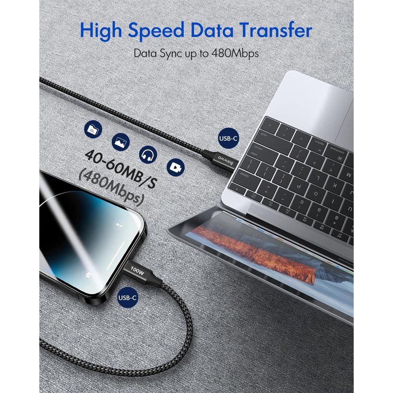 Baiwwa 100W USB C to USB C Cable [6FT 2-Pack], USB C Charger Cord Fast Charging for iPhone 16 15 Pro Max Plus, for MacBook Pro 2020, Pixel and More