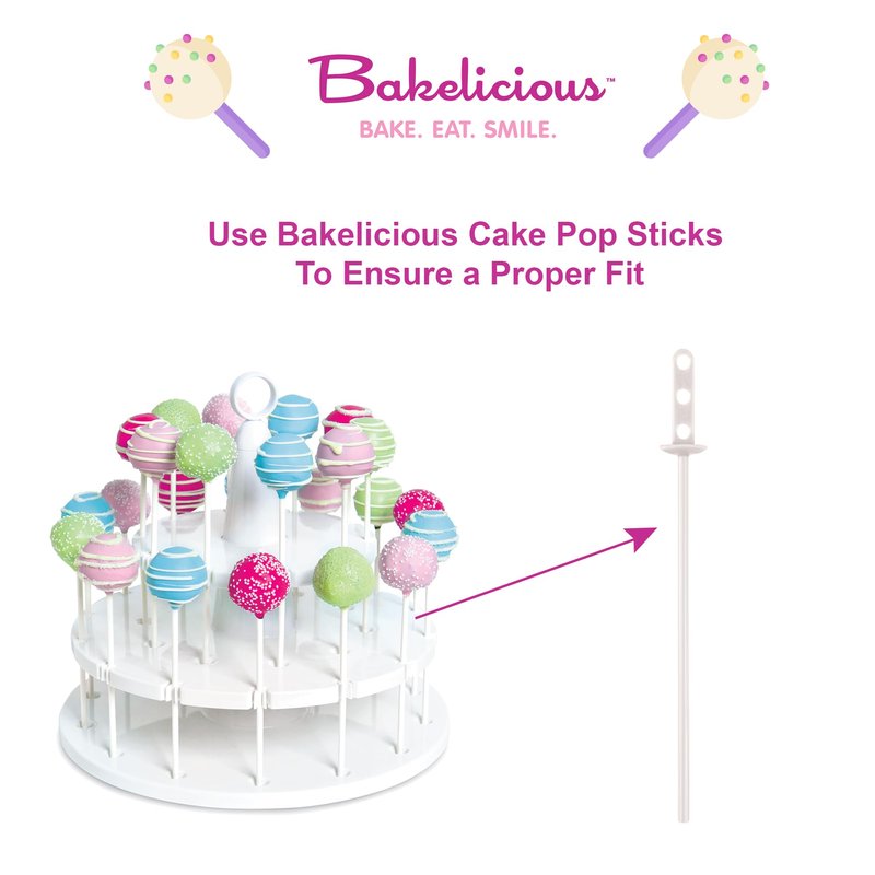 - MEASUREMENTS: This cake pop stand has dimensions of 11.25 x 11.25 x 10.5 inches. To ensure a proper fit use our Bakelicious Cake Pop Sticks Set. 4.375" stem, 1.125" spear, 5.5" total length. Also compatible with Wilton and 3.5mm sticks!