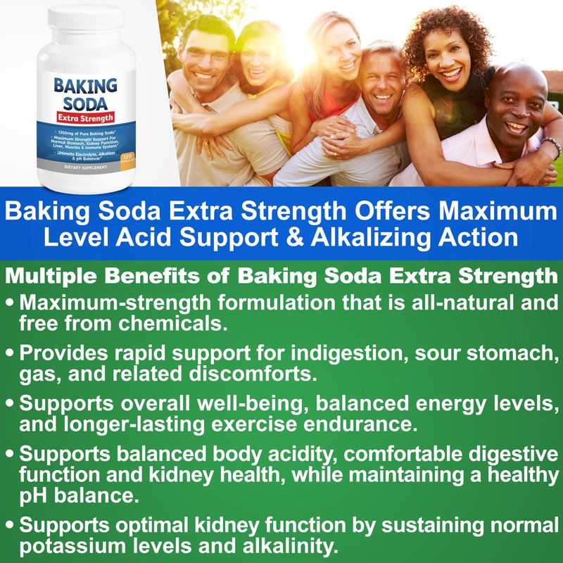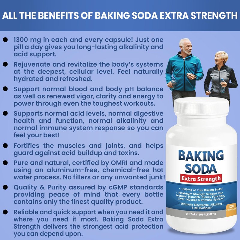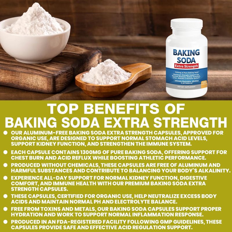- SUPPORT DIGESTIVE FUNCTION, ALKALINITY & MORE! Baking Soda Extra Strength offers hundreds of benefits. This supplement is manufactured in an FDA-registered facility using only GMP standards. It's easy to take, fast-acting, and delivers results you can rely on all day long