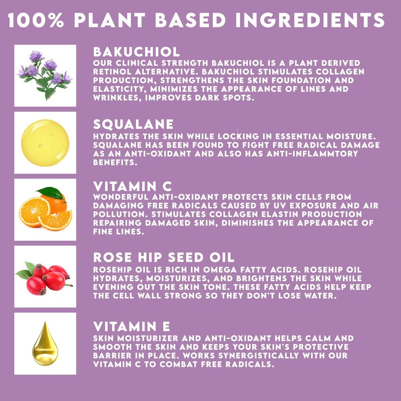 - DOCTOR FORMULATED FACIAL SERUM MADE IN THE USA with All Natural Plant Derived Ingredients: Bakuchiol, Squalane, Fat Soluble Vitamin C for better skin penetration, Rose Hip Seed Oil and Sunflower Vitamin E.