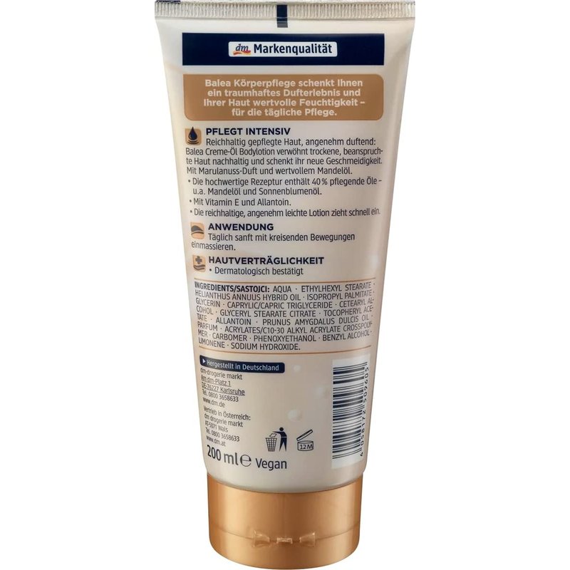 Balea cream lotion for hands based on oil is suitable for very dry hands and provides intensive care. It contains almond and shea butter, and will enchant you with the pleasant scent of marula nut. The formula does not contain microplastics or completely synthetic polymers soluble in water. Skin compatibility is dermatologically confirmed. The tube is made from 55% recycled material (excluding cap)