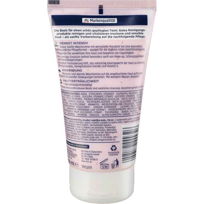 - The Balea gentle washing cream cleans and revitalizes dry and sensitive skin - as a gentle preparation for the subsequent care. The washing cream with valuable almond oil has a particularly skin-friendly care formula - especially for daily mild facial cleansing.